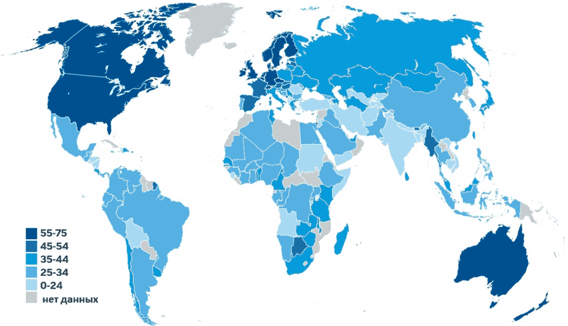Рисунок 2. Глобальное распределение процента взрослого населения, определяемого как финансово грамотное.