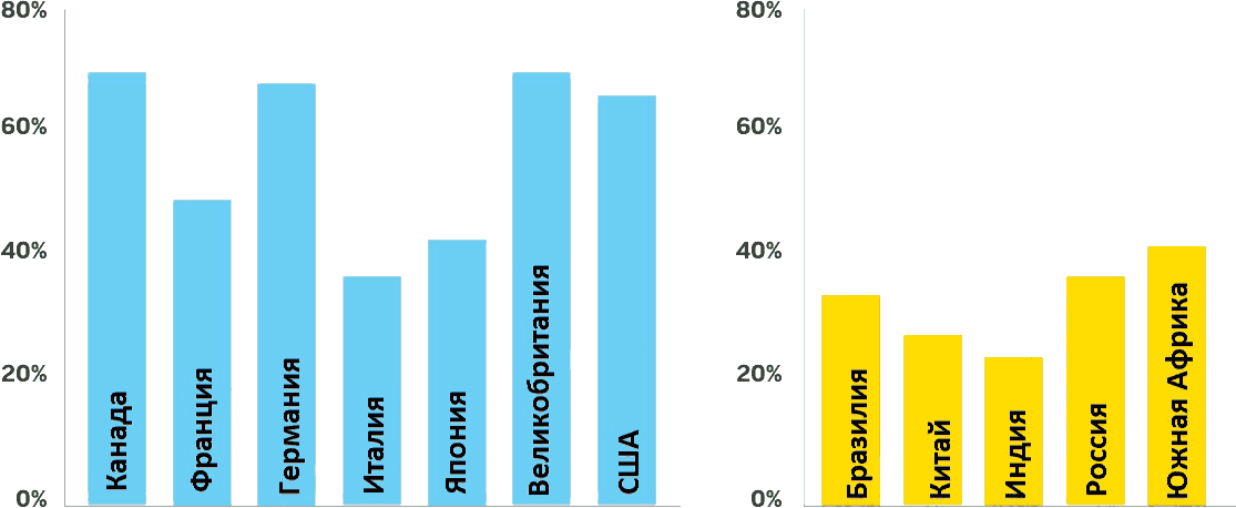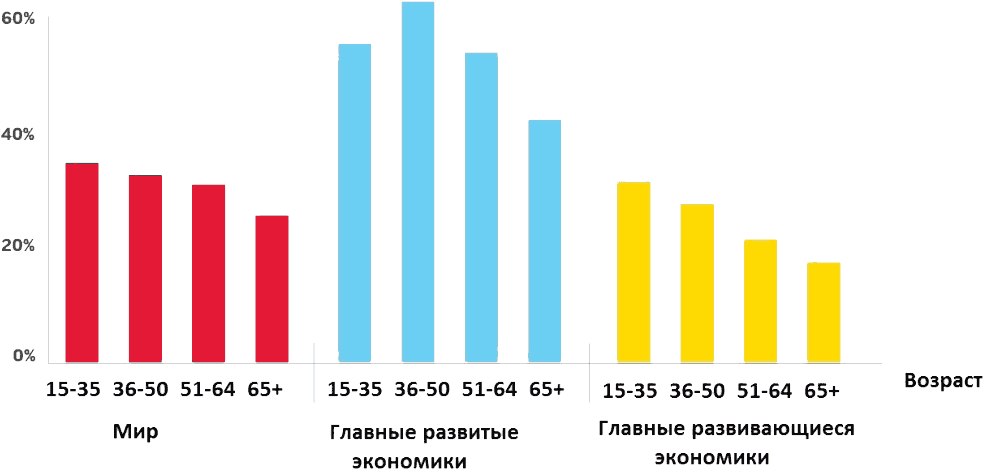 В странах с развитой экономикой, зависимость уровня финансовой грамотности от возраста выглядит следующим образом: младше 35 лет – 56 %, 36–50 лет – 63 %, и дальше с возрастом уменьшается. Но в странах с развивающимися экономиками наибольший уровень финансовой грамотности (32 %) показали люди в возрасте 15–35 лет.