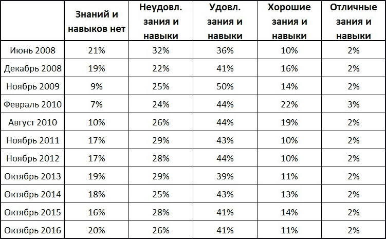 Таблица 2. Динамика субъективной оценки уровня финансовой грамотности (источники: НАФИ (2008, 2009, 2010), Мониторинг НИУ ВШЭ, 2009–2016).