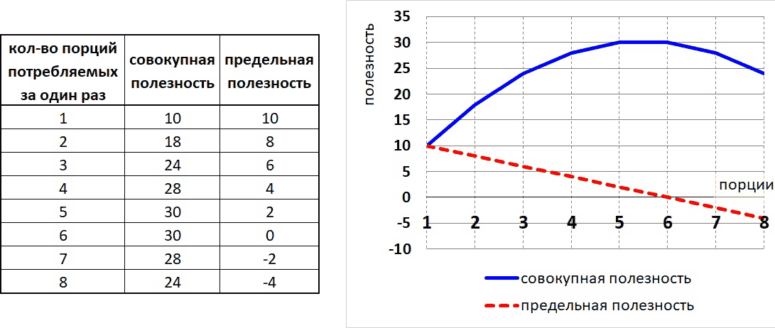 Скажем, человек скушал одну конфетку (одну единицу, одну порцию) – вкусно, сладко, приятно. Затем вторую конфетку – удовольствия получает не меньше, чем от первой. Следом третью кушает, затем четвёртую и пятую, и чувствует, что нет уже такой радости от потребления, но он сладкоежка, и не может сдержать себя, и берёт ещё одну конфетку – но удовольствие уже меньше чем от предыдущей. От следующей конфетки человек начнёт себя чувствовать скорее плохо (переедает уже), чем получать хоть какое-нибудь удовольствие. С каждой следующей потреблённой конфетой удовольствие всё меньше и меньше.