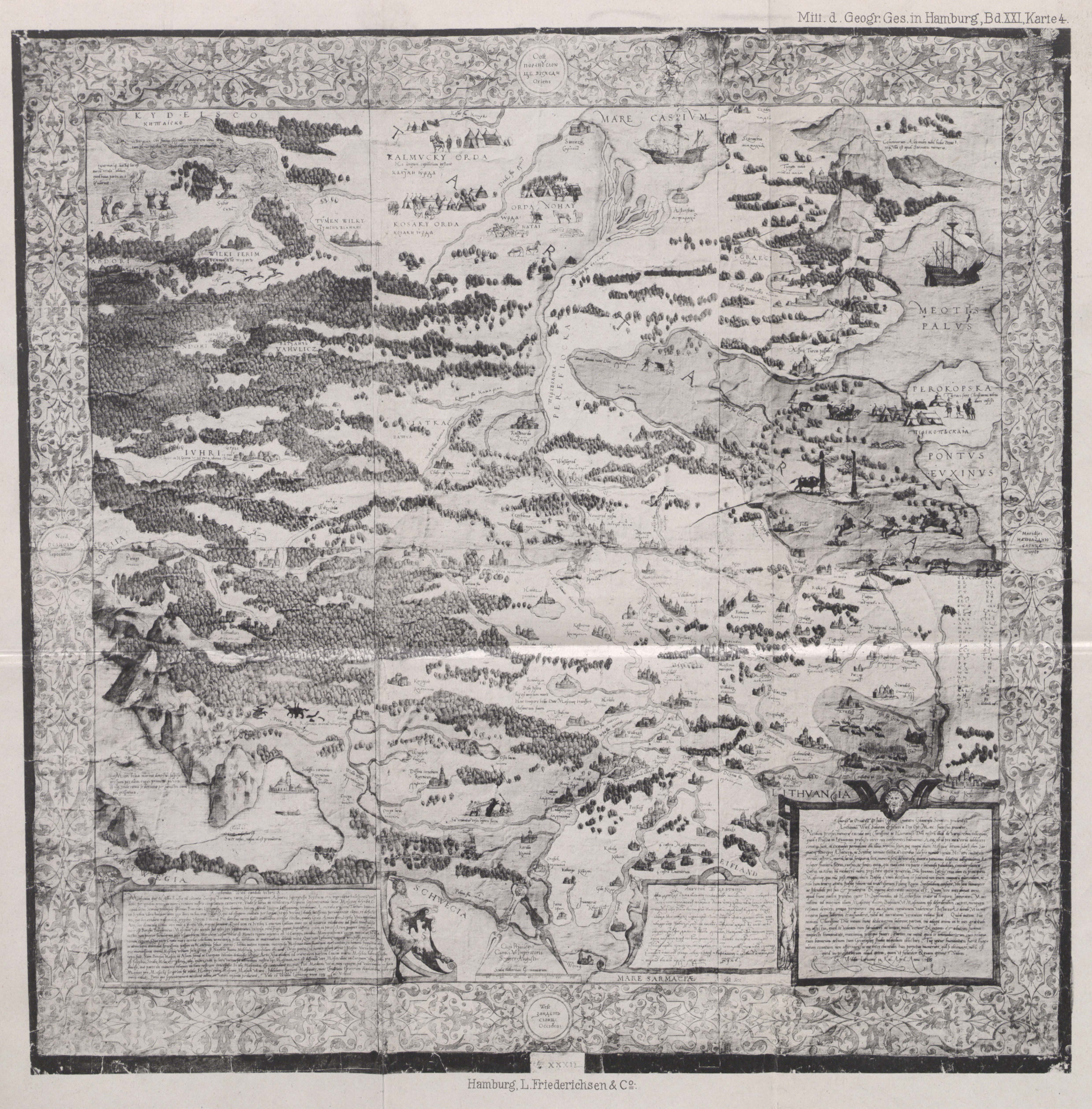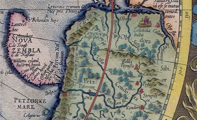 Старая карта России, которая пробудила во мне желание изучить и по возможности найти мифического идола, – «План Антония Вида и Ивана Ляцкого», 1542, в издании Михова. На крайнем северо-востоке (левый верхний угол карты), к западу от среднего течения Оби, изображено поклонение 7 фигур, олицетворяющих северный народ абдоров (Аbdori), идолу – обнаженной женской фигуре, стоящей на высоком постаменте в виде тумбы, держащей в руках огромный рог изобилия; вокруг разбросаны дары – шкурки животных. Подпись на латыни "Золотаiя Баба – hoc est aurea uetula idolum quod huius partis incolae
