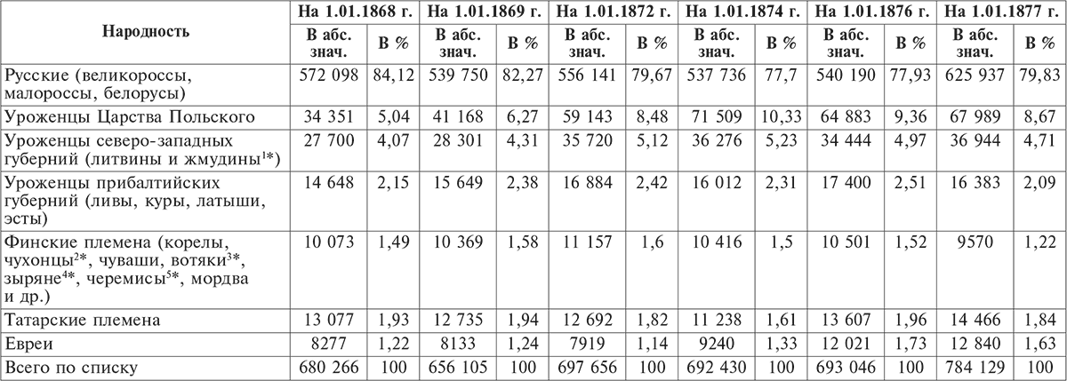 Таблица 2. Личный состав строевых и нестроевых нижних чинов в войсках по племенам за 1868-1877 гг.
