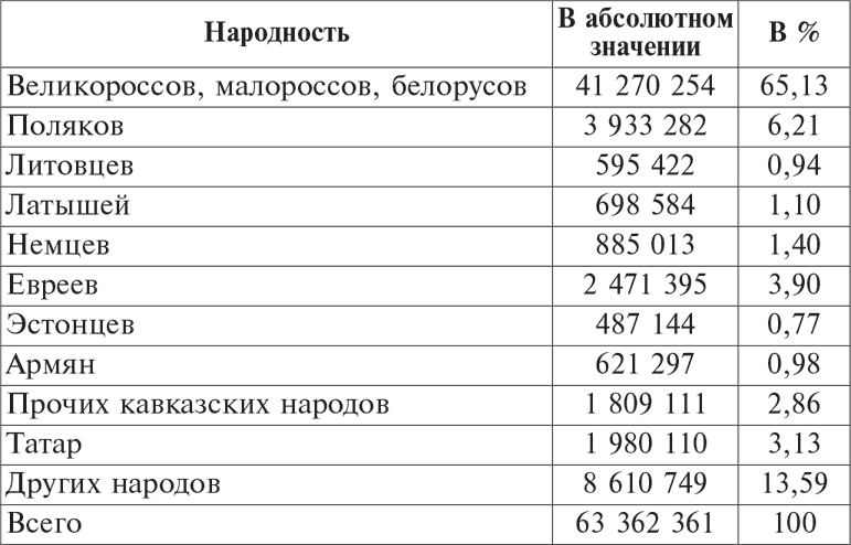 Перед началом Первой мировой войны положение оставалось прежним. Так, по итогам призыва 1912 г. (в этом году последний раз публиковался этнический состав армии) числилось 76,8 % (см. таблицы 4 и 5) восточных славян среди нижних чинов и 85,8 % среди офицеров[253]. В то время, согласно данным Центрального статистического комитета МВД Российской империи, по состоянию на 1913 г. русские (включая 43,4 % великороссов, 17,4 % малороссов и 4,6 % белорусов) составляли лишь 65,5 % населения империи[254]. До самого дня падения монархии многомиллионные массы подданных, населявших окраины империи, не состояли на воинском учете и не подлежали мобилизации и призыву.