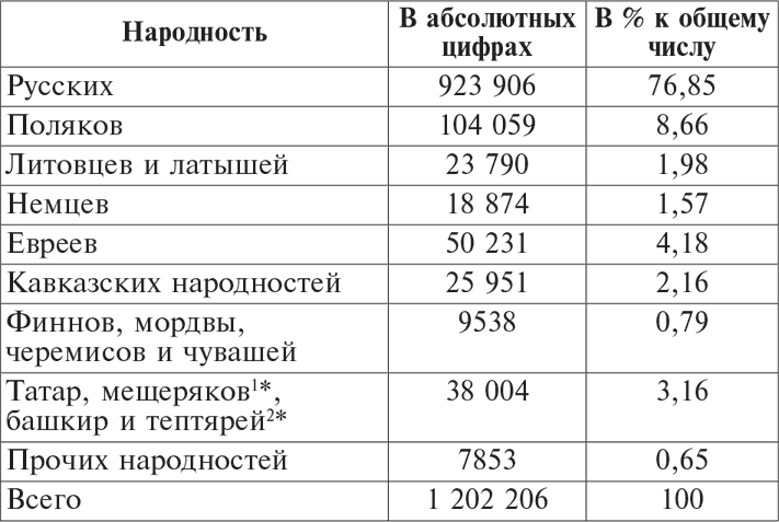На рубеже веков при комплектовании воинских частей в регионах с нерусским населением, как правило, применялась простая пропорция: 75 % русских и 25 % нерусских[233]. Для этого территория Европейской России делилась на две части – русскую (куда входили губернии с великороссийским, малороссийским и белорусским населением) и инородческую (губернии польские, прибалтийские, литовские и Бессарабская). Первые разбивались на участки комплектования армейских полков (по одному-два уезда); четыре смежных участка объединялись в дивизионный район комплектования. Каждому такому району дополнительно назначались инородческие уезды, дававшие четверть пополнения[234].