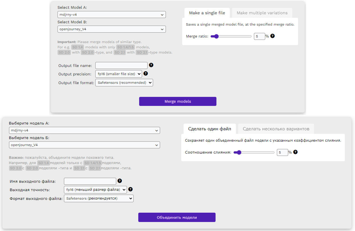 При помощи окна «Merge models» / «Объединить модели» можно объединять между собой различные модели. Например, те, что мы скачивали после установки из сети Интернет.