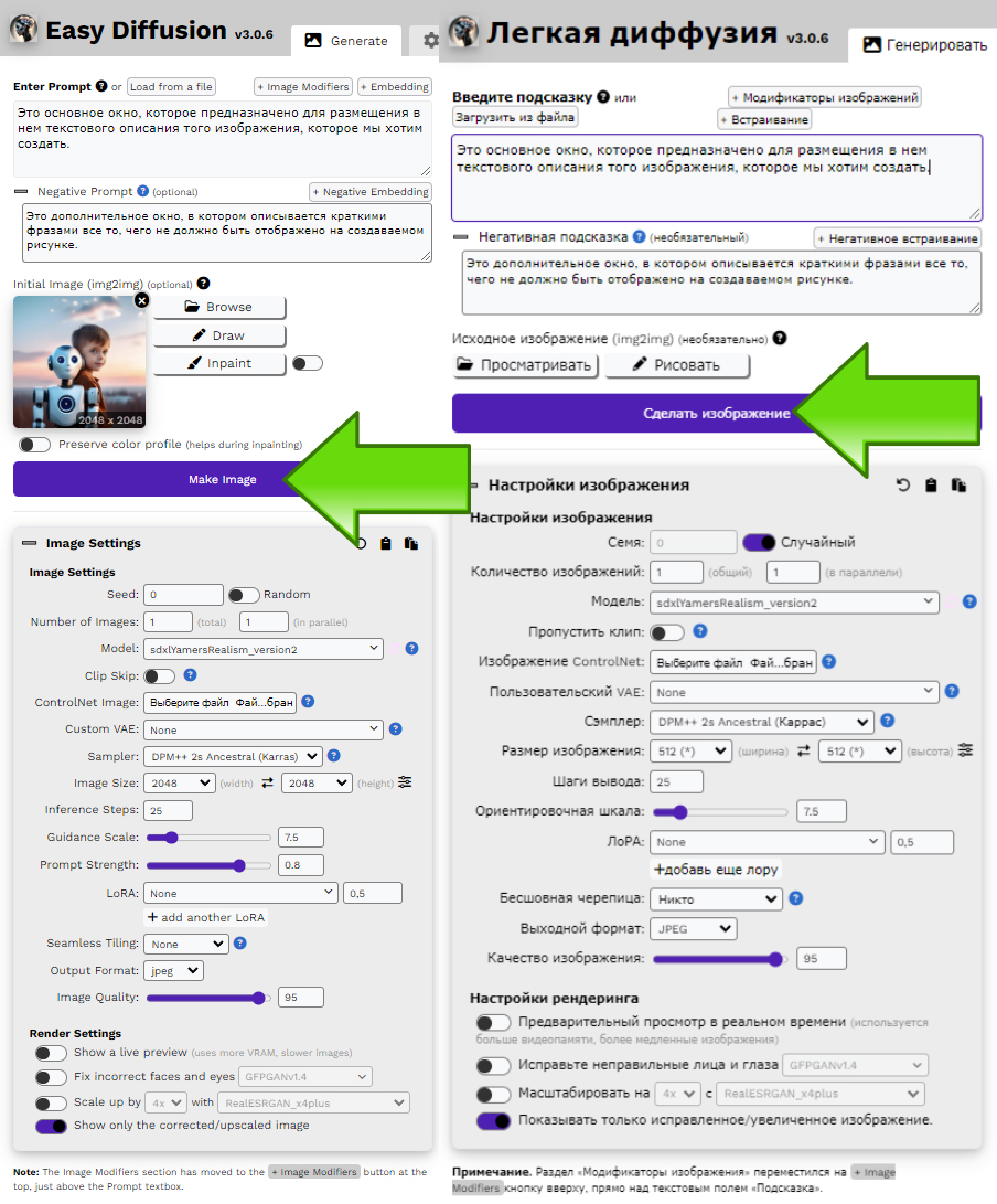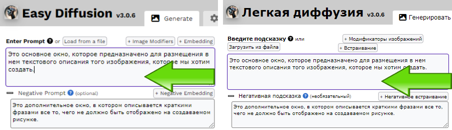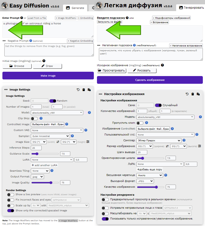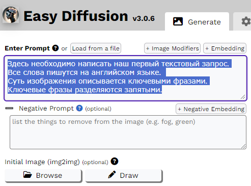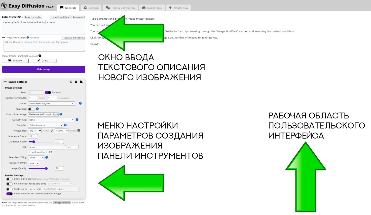 Еще раз обращу ваше внимание на то, что основное назначение Easy Diffusion заключается в создании из текстового описания или из комбинации текста и изображения нового уникального изображения на базе самых популярных на сегодняшний день нейросетевых моделей (которые мы скачали и установили ранее).