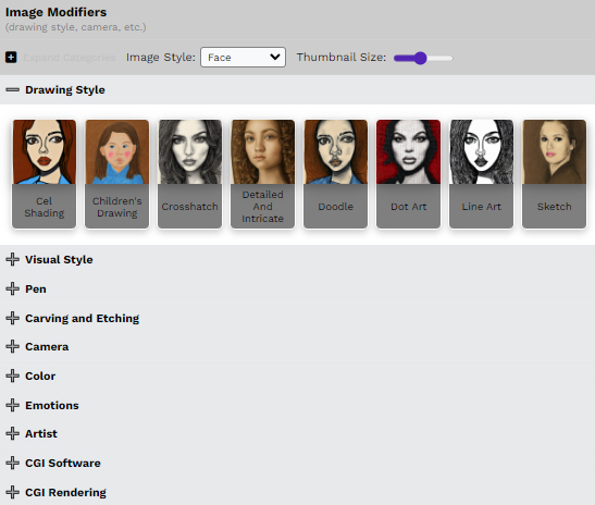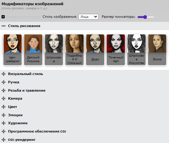 «Image Modifiers» / «Модификаторы изображения». Очень полезная кнопка, особенно на первых порах, когда вы еще не научились составлять сложные описания новых изображений. В модификаторах вы можете выбрать несколько разных фильтров для своих изображений:
