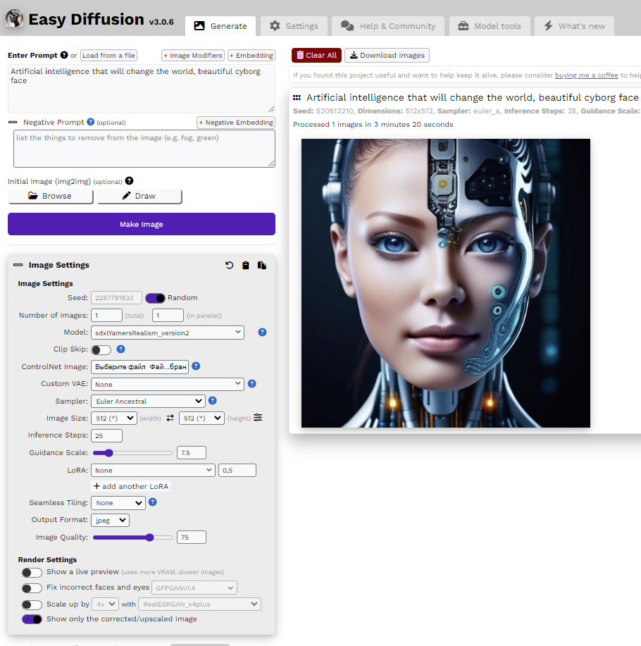 В окне «Enter Prompt» / «Ввести запрос» напишем следующий запрос на английском языке: «Artificial intelligence that will change the world, beautiful cyborg face» («Искусственный интеллект, который изменит мир, красивое лицо киборга»). Обратите внимание, что система Easy Diffusion понимает запросы только на английском языке. Если вы не очень сильны в нем, воспользуйтесь, пожалуйста, любым доступным вам онлайн-переводчиком.