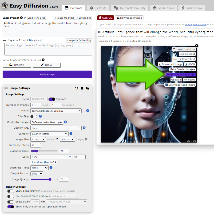 «Draw another 25 steps» / «Нарисовать еще 25 шагов». Если вы считаете, что изображение нужно улучшить, выполните команду «Draw another 25 steps». Часто бывает так, что деталей картинки станет больше и ее качество станет лучше. Бывает и так, что особых изменений незаметно. Тут требуется терпение и упорство.