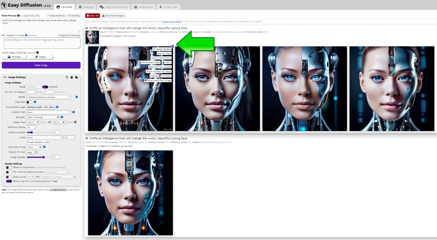 Как я раньше отмечал, у всех без исключения моделей, которые мы дополнительно установили в Easy Diffusion, есть один существенный недостаток – они плохо прорисовывают глаза или пальцы рук, а также очень часто на картинках появляются разные странные артефакты. Чтобы откорректировать глаза, на понравившемся нам изображении необходимо снова навести мышку на картинку и выполнить команду «Fix Faces» («Исправить лица»):