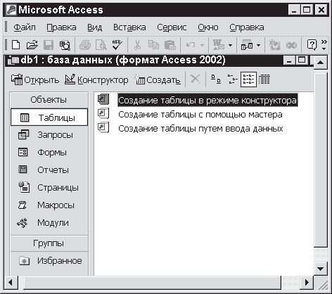 Формирование БД в Access состоит из ряда последовательных этапов, описываемых ниже. Первый этап этого процесса – создание таблиц. Таблицы в Access являются теми первичными, исходными файлами, на основе которых в дальнейшем строится все здание базы данных. Access 2002, как и предыдущие версии, предоставляет пользователю несколько разных вариантов построения таблиц, а также возможность применения дополнительных аналитических табличных структур.