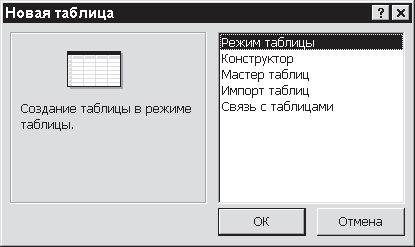 на панели окна БД. В диалоговом окне Новая таблица, показанном на рис. 3.2, представлены все возможные параметры создания таблицы: