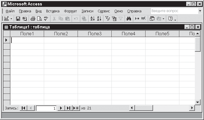 Войти в этот режим можно двумя способами: либо выбрав пункт Режим таблицы в окне Новая таблица (см. рис. 3.2) и щелкнув по кнопке ОК, либо выбрав опцию Создание таблицы путем ввода данных в окне базы данных (см. рис. 3.1). В результате на экране появится таблица, готовая к вводу информации (рис. 3.3).