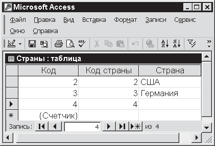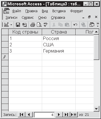 Если вы выберете пункт Отмена, таблица вновь примет тот вид, который показан на рис. 3.4. Однако это промежуточное состояние, из которого все равно надо как-то выходить. Внимательно посмотрите на первичные коды, созданные системой в поле Код. Здесь они ничем не отличаются от кодов, созданных пользователем в поле Код страны. Но в общем случае коды, введенные в это поле, совсем не обязаны быть такими же упорядоченными, как коды поля Код, – таблица, показанная на рис. 3.6, представляет собой словарь, и коды могут периодически изменяться. Поэтому для надежного контроля за файлами в Access предусмотрен механизм системных первичных кодов. Иногда (как, например, сейчас) они вводятся только по желанию пользователя. В других случаях при отсутствии этих кодов ряд функций Access 2002 выполняться не будет.