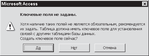 Когда все это будет сделано, вы получите предупреждение о том, что ключевые поля не заданы, как показано на рис. 3.5.