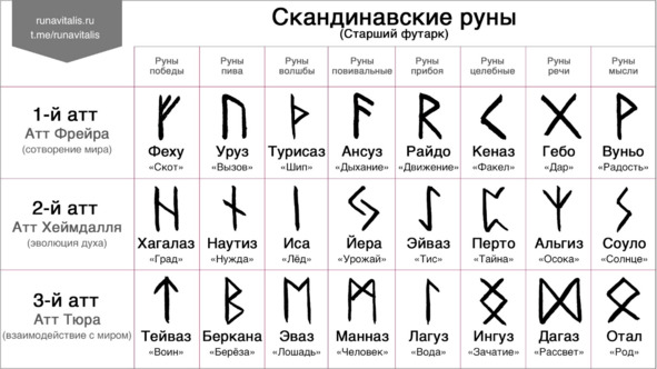 FuhuUruzThurisazAnsuzRaithoKenazСтарший футарк содержит 24 руны, разделённых на три ряда (три атта) по 8 символов. Каждый атт имеет свое название, связанное с одним из богов скандинавского пантеона.