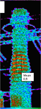 На рис. 1.18 и рис. 1.19 изображен ТТ 330 кВ в обычном видимом диапазоне и в инфракрасном. Нормы ХАРГ для ТТ-330 на тот момент отсутствовали, можно было опираться только на результаты накопленного опыта. Обычно эти данные сравнивали с ХАРГ трансформаторов с трех фаз присоединения, так как одновременно не бывает 3 плохих изделия. В данном случае при DT =1,0°C соответствовало tgб расч. =1,4% (25.05.98), DT=2,2°C соответствовало tgб расч. = 2,6% (от 02.06.98), измеренный при рабочем напряжении tgб составил tgб =1,2% (26.06.98). По совокупным результатам этих диагностических измерений ТТ 330 кВ демонтирован и заменен.