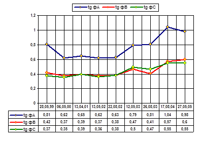 Как видно из графика, значение tg на фазе «А» даже превысило соответствующие величины tg на на фазе «В» (поврежденная) и на фазе «С» (неповрежденная). Видимо, значение tg на поврежденной фазе «В» возрастало в период высоких летних температур более быстрыми темпами чем на соседних фазах с момента последних измерений 27.05.2005 и до момента повреждения 25.07.2005.