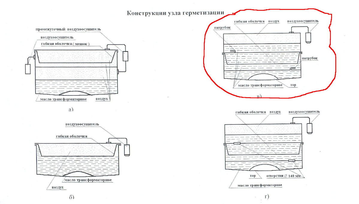 Рис. 1.25. Различные конструкции нижнего бака маслорасширителя ТТ-330 кВ типа ТФРМ: а) Тип 1 – “мешок” из фторолоновой лакоткани в металлическом баке; б) Тип 2 – “мембрана” (диафрагма) из фторолоновой лакоткани или литой резины на масле; в), г) Тип 3 – резиновая диафрагма между металлическими баками, масло под и над диафрагмой сообщается через патрубки или отверстия (данный тип используется в этом случае).