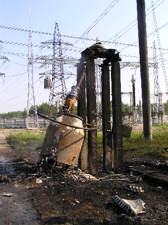 Приведём пример того, к чему приводит игнорирование рекомендаций тепловизионного обследования. При обследовании на подстанции 110 кВ был обнаружен ТТ-110 с перегревом величиной T =0,8C, несмотря на рекомендации обслуживающий персонал и руководство подстанции не приняли никаких мер по выявлению причин перегрева и через 6 месяцев с момента обнаружения дефекта ТТ-110 кВ произошел его взрыв (рис. 1.20) [4-15].