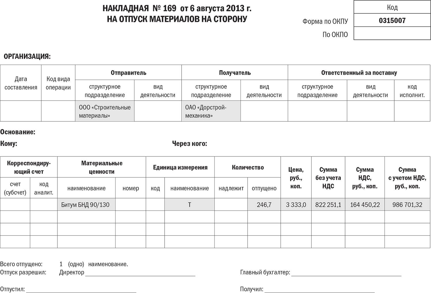 Другой документ – накладная на отпуск материалов на сторону (табл. 5.1).