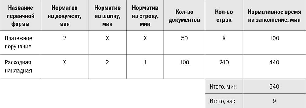 Допустим, мы установили нормативное время на ввод одного платежного поручения в информационную систему – 2 минуты. За день бухгалтером было введено 50 платежек. Умножаем 2 минуты на 50, получаем 100 минут. С накладной сложнее. Норматив на шапку – 2 минуты, норматив на строку – 1 минута. Количество документов – 100 (итого на ввод шапки 2 × 100 = 200), количество строк – 240 (итого на ввод строк 1 × 240 = 240). Следовательно, по нормативу должно быть израсходовано 440 минут на заполнение 100 накладных. Складываем с платежками и получаем 540 минут, или 9 часов работы бухгалтера.