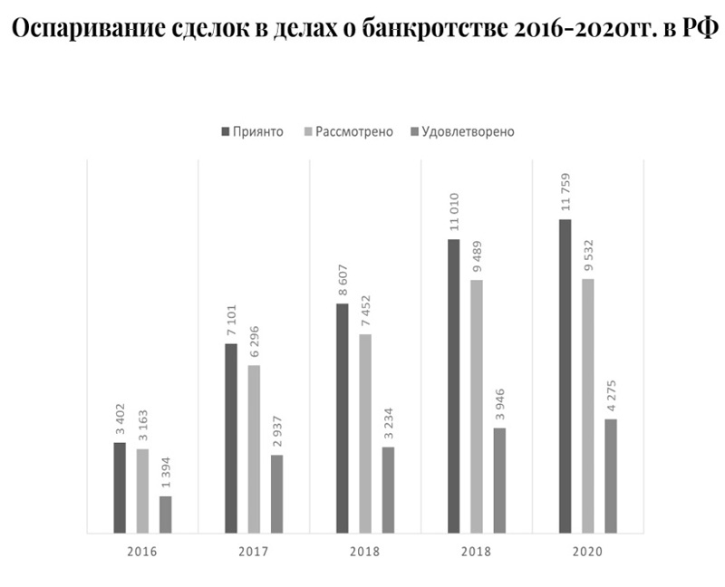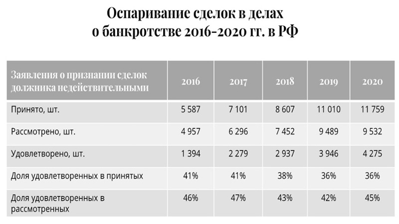 При этом практически в каждой процедуре банкротства кредиторами и арбитражными управляющими оспариваются сделки, т. е. даже добросовестный участник хозяйственных отношений (ведения бизнеса) не может в полной мере застраховать себя от потенциальной подачи заявления об оспаривании сделки. Специфика банкротства такова, что в рамках этой процедуры «под удар» попадают в том числе законные/реальные сделки (например, ст. 61.3 ФЗ «О несостоятельности (банкротстве)»), достаточно, чтобы сделка попала в 6-месячный предбанкротный период. Более того, «под удар» могут попасть и сделки, совершённые в 3-летний срок до принятия заявления о признании должника банкротом. Так, согласно официальной статистике ЕФРСБ: