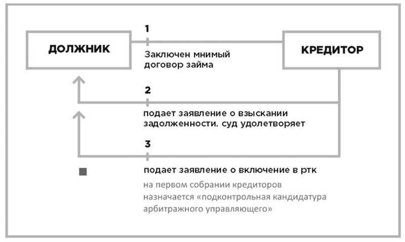 Согласно недавним поправкам в законе, к субсидиарной ответственности (дополнительной личной ответственности владельцев бизнеса по долгам компаний-должников) начали привлекать и реальных бенефициаров, не имеющих прямой юридической связи с фактически подконтрольными им компаниями-должниками. Последние хотят снизить свои материально-правовые риски. Для этого они пытаются получить контроль над процедурой банкротства, используя схемы с «подконтрольными арбитражными управляющими». Делается это при помощи различных схем по созданию мнимой («искусственной») кредиторской задолженности. Суть которых сводится к следующему: непосредственно перед процедурой своего банкротства должник заключает мнимую гражданско-правовую сделку с «дружественной компанией», надлежаще подписывая всю документацию по ней. Но при этом реальных работ или оказания услуг должнику не производится. В последующем у должника возникает мнимая кредиторская задолженность, которую он не погашает.