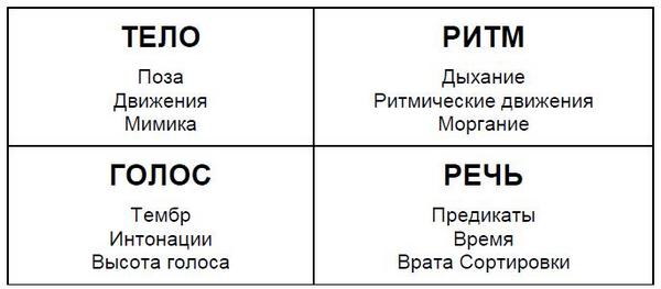 Теперь по поводу Ритма – я его выделил в отдельный блок, потому что ритм наиболее сильно определяет внутреннее состояние. И если поза и движения наиболее заметны, и под них проще подстраиваться, то под ритм, на мой взгляд, подстраиваться важнее. Сам по себе он не несет большого количества информации, но зато подстройка под него очень легко помогает стать «своим». А выражается он внешне и в го– лосе и в движениях.
