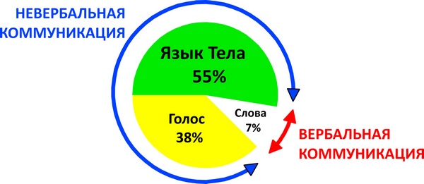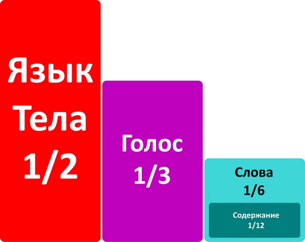 На диаграмме приведен анализ воздействия во время презентации[3] перед группой людей. При этом 55 % – это Язык Тела (позы, движе– ния, мимика), около 38 % – Голос (тон, интонации, ритм, тембр) и около 7 % – собственно Слова.