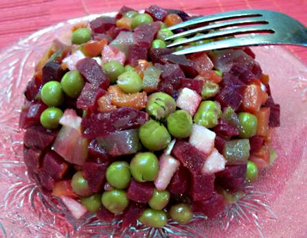 солёные огурцы – 25 г, свёкла – 50 г, яблоки – 30 г, морковь – 25 г, консервированный зелёный горошек – 20 г, масло растительное – 8 г, сок лимона, перец, соль.