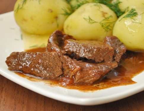 Мясо порционными кусками разложите по тарелкам.