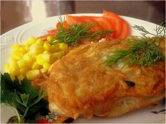 рыба (треска, пикша и т. д.) – 120 г, яйцо – 1 шт., картофель – 240 г, мука пшеничная 1 сорта – 5 г, растительное масло – 10 г, кукуруза консервированная – 20 г, помидоры свежие – 30 г, зелень – 5 г, соль.