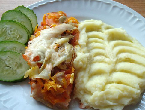 филе форели (сёмги или лосося) – 120 г, шампиньоны – 30 г, лук репчатый – 15 г, морковь – 10 г, помидор свежий – 30 г, сыр – 10 г, картофель – 315 г, масло коровье – 5 г, масло растительное – 8 г, перец черный молотый, соль.