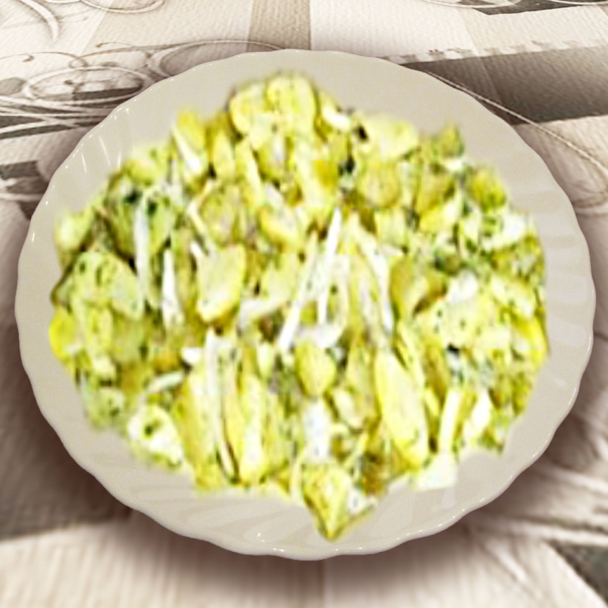 картофель – 95 г, лук репчатый – 15 г, масло растительное – 8 г, огурец солёный – 30 г, зелень – 10 г, соль, перец.