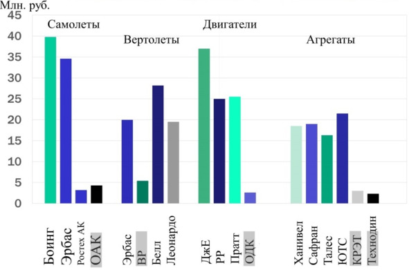 Сегодня мы заметно отстаем, например, от лидеров мировой авиационной промышленности в 5…8 раз по выработке на сотрудника. Статистика для авиационной промышленности мира по данным журнала «Эксперт» (2017 г.) показана на рис. 1. Аналогичная картина по производительности труда в ряде других высокотехнологичных отраслей.