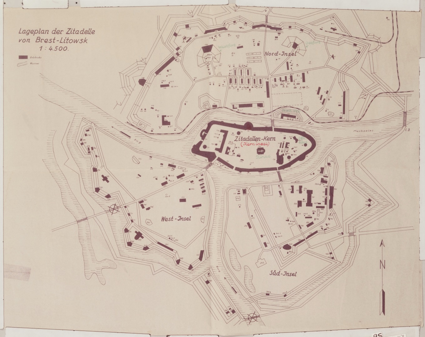 – Есть! – беру рисунок и иду к дальней стенке каземата, к столу. Выставляю поудобнее лампу и рассматриваю выданный Раушем листок. В верхнем левом углу надпись: карта цитадели Брест-Литовска. Масштаб 1:4500. И коротенькая легенда, всего две надписи: здания и вода. Основную часть листа занимает старательно вычерченная схема крепости. Сделана она от руки или напечатана в типографии, – сказать не берусь, но выполнена схема довольно качественно.