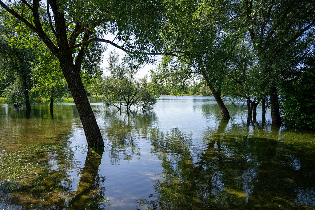 Под мощными осокорями стайки верхоплавок-баклешек плещут в поисках пропитания. Прибылая вода неумолимо поглощает глинистые берега. Буйной листвой ландыш местами уходит под воду. Кормовая волна шевелит и купает жемчужины цветов.
