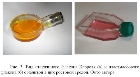 Раковые клетки имеют несколько основных отличий от нормальных. Прежде всего, это отсутствие «тормозов», т.е. раковая клетка не подчиняется сигналам соседних нормальных клеток организма, которые «говорят», что делиться не надо, однако раковая клетка игнорирует эти сигналы и делится непрерывно, если к ней поступают необходимые питательные вещества и есть пространство для размножения. Свойство прекращения деления клеток при соприкосновении клеток друг с другом или с клетками другого типа называется контактном торможением. У раковых клеток контактное торможение отсутствует. Затем, наследуемость – перенос свойства онкопотенции от одной клетки к дочерней после деления, т.е из одной раковой клетки после деления получаются две раковые клетки, после деления этих двух клеток, образуются уже четыре раковые клетки и т. д. Другое основное свойство – злокачественность, – способность больных клеток переноситься с током крови из одного места организма в другое, оседать там и образовывать метастазы – точки роста новых опухолей. Также имеется другое существенное свойство раковых клеток – способность к неограниченному числу делений. Это хорошо видно на примере роста клеток в искусственных условиях в так называемых флаконах Карреля. Впервые клетки животных вне организма научился выращивать ученый Алекс Каррель в начале 20 века. Именно по его имени и стали называть культуральные флаконы. Флакон представляет собой плоский стеклянный сосуд, который кладется широким боком горизонтально. Со стороны одного бока у флакона имеется узкое изогнутое вверх горлышко, которое может герметично закрываться (Рис. 3а). В него заливается ростовая среда, представляющая собой раствор различных аминокислот и микроэлементов, к которому добавляется еще 10—20% сыворотки крови животных для поддержания роста клеток. Ранее флаконы изготавливались из стекла, а позже стали делать из пластмассы (Рис. 3б). Клетки помещают во флакон, они прикрепляются к его дну и начинают делиться. Нормальные, не раковые клетки могут поделиться в таких флаконах определенное число раз, а потом прекращают деление. В то же время раковые клетки способны делиться неограниченно.