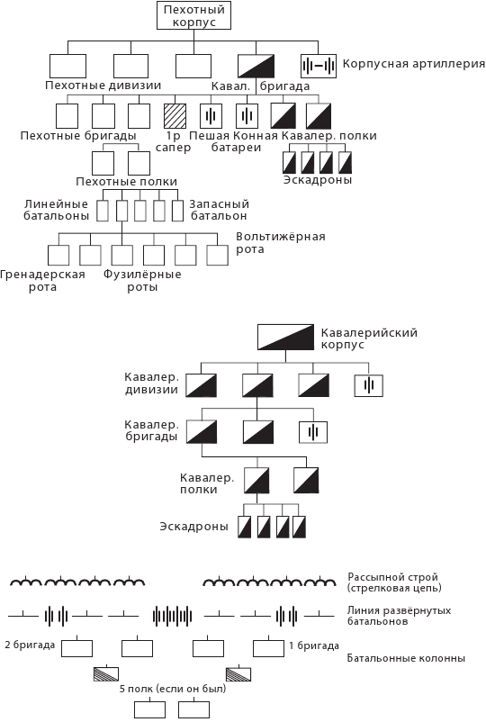 Французский пехотный корпус, бывший основным стратегическим и оперативным соединением французской армии, не имел такой чёткой и фиксированной структуры, как русский. Кроме того, в отличие от русского корпуса, он был высшей организационной единицей (у русских это была армия, включавшая несколько корпусов), включал все три рода войск и мог вести полностью самостоятельные действия на стратегическом направлении без дополнительного усиления. В его состав входили 2–5 пехотных дивизий, 1–2 кавалерийские бригады или дивизии, корпусная артиллерия, которая отчасти компенсировала более слабую, чем в русской армии, дивизионную артиллерию. Пехотная дивизия имела в своём составе 3 бригады по 2 полка в каждой и обычно 2 артиллерийские батареи. Полк состоял из 4 линейных и одного запасного батальона. Правда, это деление не было жёстким. Например, в 1-м пехотном корпусе Даву полки насчитывали по 5 линейных батальонов и 1 запасной, но бригада состояла из одного полка, то есть по сути полковое звено отсутствовало. Батальон состоял из 6 рот (1 гренадерской, 4 фузилёрных и 1 вольтижёрной). Вольтижеры являлись аналогом наших егерей, но, в отличие от последних, чаще не были выделены в отдельные бригады, полки и батальоны, а были рассредоточены в составе линейных батальонов. Это не давало возможности использовать их отдельно в качестве сил завязки боя на поле сражения, зато позволяло лучше организовывать взаимодействие батальонных колонн и стрелковой цепи в боевых порядках дивизии. Также это дало французам возможность применять более сложные, чем в русской армии, боевые порядки дивизии.