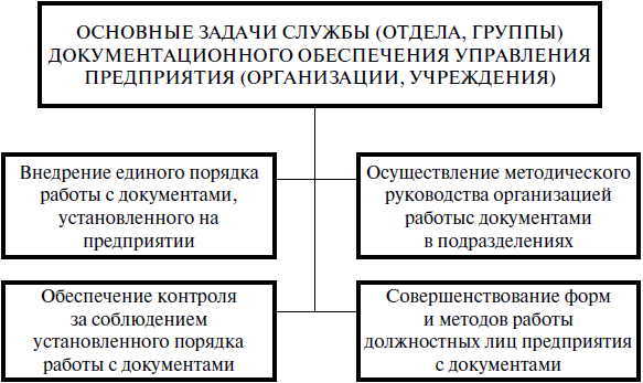 Назначение службы ДОУ заключается в организации, ведении и совершенствовании системы документационного обеспечения управления предприятия. Основные задачи службы (отдела, группы) ДОУ представлены на схеме 1.