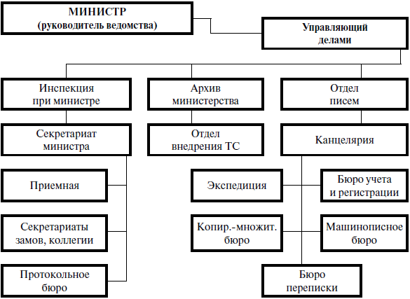 инспекция при министре (руководителе ведомства, организации, учреждения) (в свою очередь, включает канцелярию (бюро переписки), бюро учета и регистрации документов, экспедицию, машинописное бюро, копировально-множительное бюро, телетайпную);