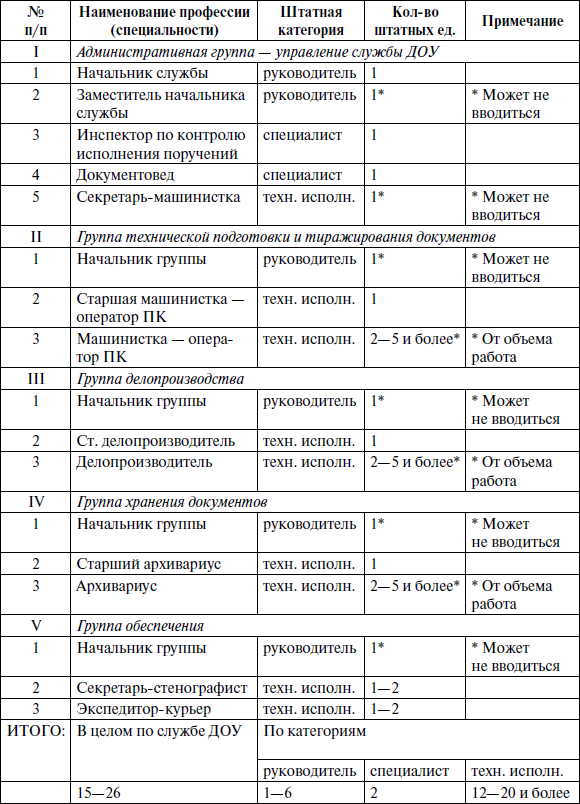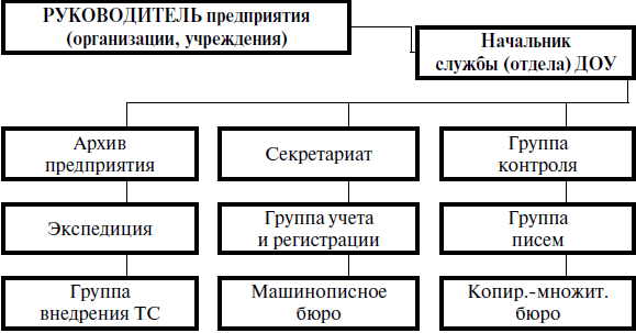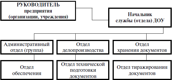 В соответствии с положениями Государственной системы документационного обеспечения управления (далее – ГСДОУ)[17] документационное обеспечение управления на предприятиях должно осуществляться специально уполномоченным подразделением – службой документационного обеспечения управления (далее – службой ДОУ). Такая служба (отдел, группа и т. п.) функционирует на предприятии с численностью персонала свыше 250 работников в качестве самостоятельного структурного подразделения, возглавляемого руководителем службы и подчиненного непосредственно руководителю предприятия[18].
