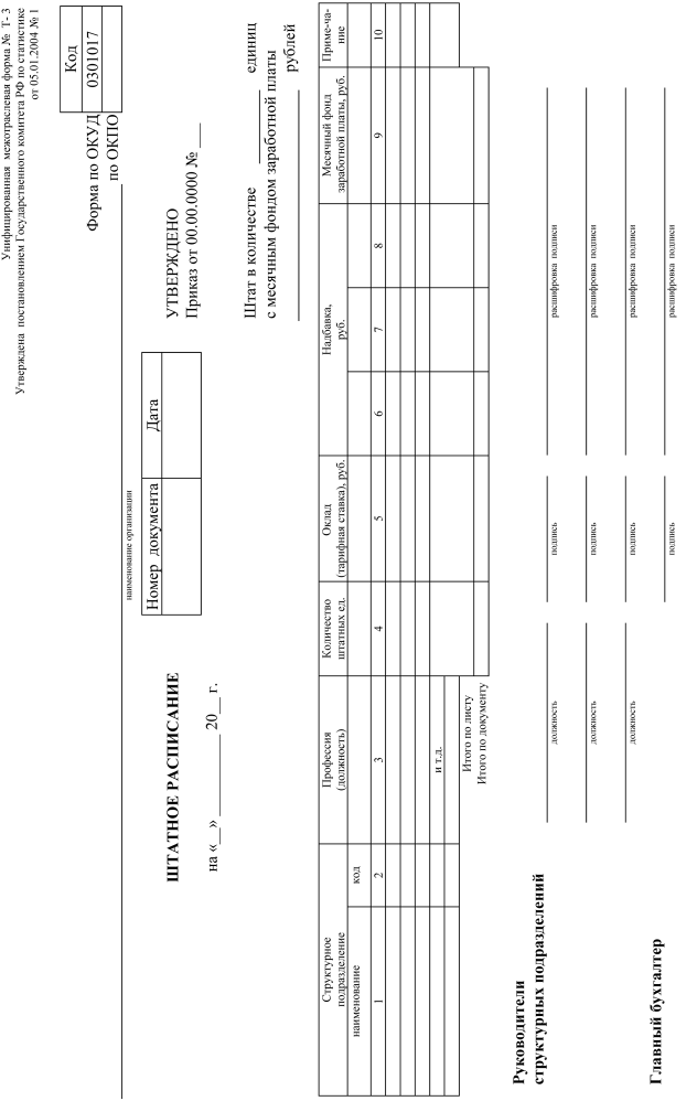 Штатное расписание – локальный нормативный акт, устанавливающий структуру и квалификационно-численный состав работников предприятия по структурным подразделениям (участкам работы, включая службу ДОУ) и в целом на предстоящий календарный год. Унифицированная форма документа утверждена постановлением Госкомстата России от 5 января 2004 г. № 1.