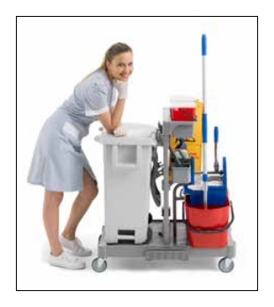 Как правило, для удобства все оборудование и материалы складируются на специальную тележку, для возможности легкой транспортировки всего арсенала к месту выполнения уборки. Надо отметить, что такой способ организации в значительной степени сокращает время выполнения уборки и физическую нагрузку на линейный персонал.