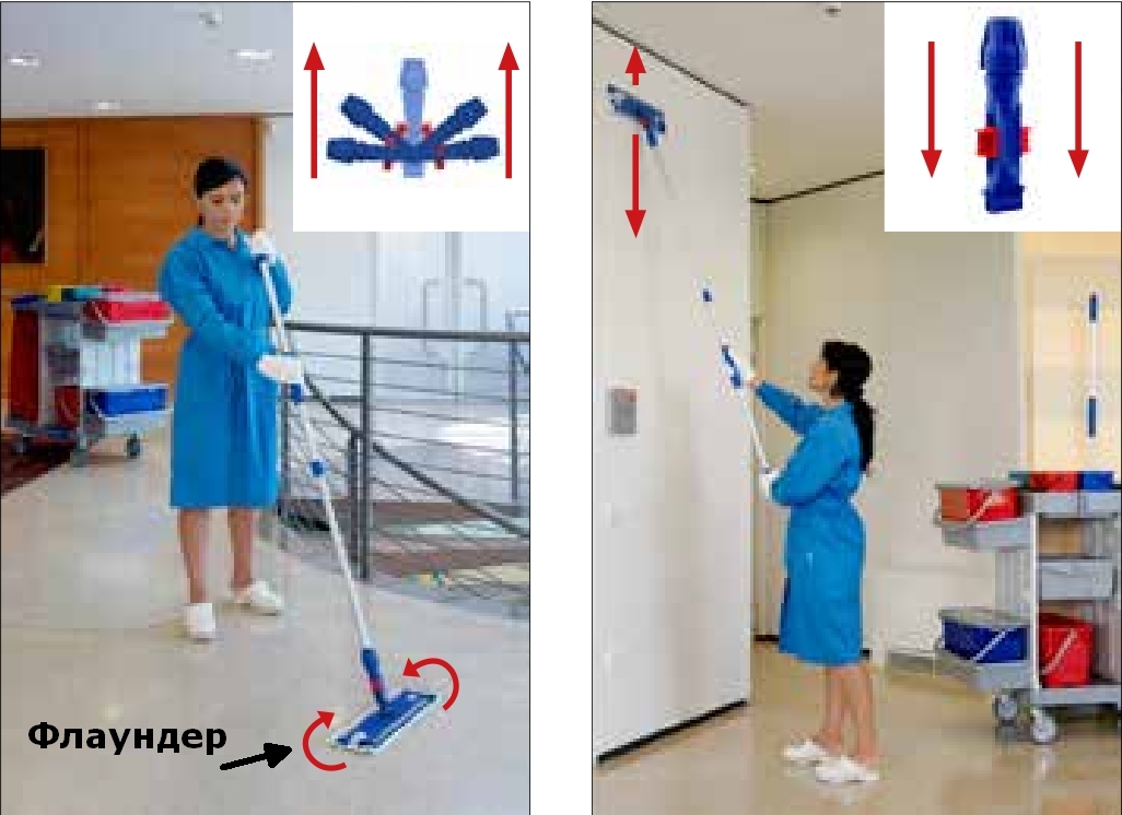 Флаундеры бывают 2 х основных видов. Рамочный флаундер – легкая складная металлическая рамка, для сухой уборки. Плотная пластиковая рамка, обеспечивающая хороший прижим для влажной уборки. Имеются различные дополнения которые облегчают процесс уборки. Так на рисунке ниже показано выполнение клининга полов и стен одной из моделей швабры с вертикальной блокировкой, компании Filmop. Обратите внимание, в этой модели флаундер имеет специальную блокировку для работы по вертикальным поверхностям.