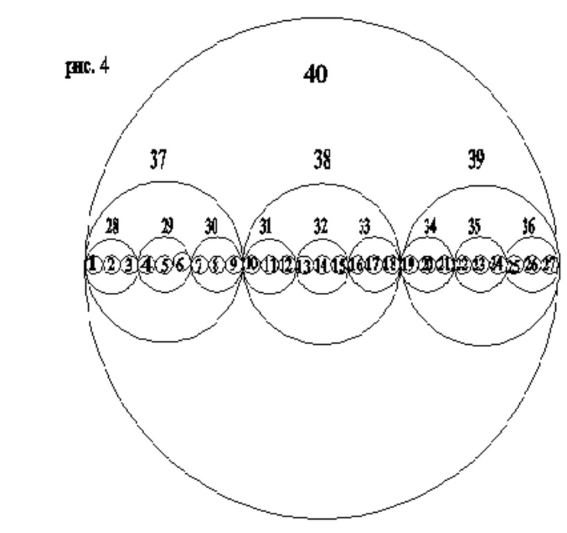 А чтобы понять, что это за связь, надо вернуться к Кругу Универсума Николая Кузанского и пронумеровать по порядку его ячейки (см. рис. 4). Мы увидим, что ряд натуральных чисел точно вписывается в структуру Круга36 и, значит, не является уходящей в бесконечность последовательностью, а представляет собой структуру, соответствующую структуре Круга. Здесь число 40, будучи преобразованным в четверку, совпадает со структурной единицей Круга, состоящей из круга со вписанными в него тремя окружностями, а единица эта, в свою очередь, содержит в себе весь ряд натуральных чисел37.