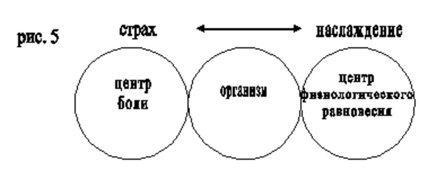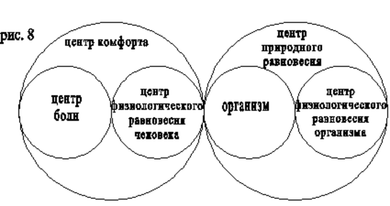 То обстоятельство, что центр комфорта совпадает с центром физиологического равновесия человека, но является противоположным центру природного равновесия, приводит к следствию, важность которого трудно переоценить. Оно состоит в том, что центр комфорта, находясь в стороне от центра природного равновесия, совпадает тем самым с центром боли всех простых организмов. В результате возникает в высшей степени парадоксальная ситуация: если простому организму, чтобы достигнуть центра физиологического равновесия, нужно от центра боли удалиться, то человеку, чтобы прийти к тому же самому результату, нужно к центру боли приблизиться.