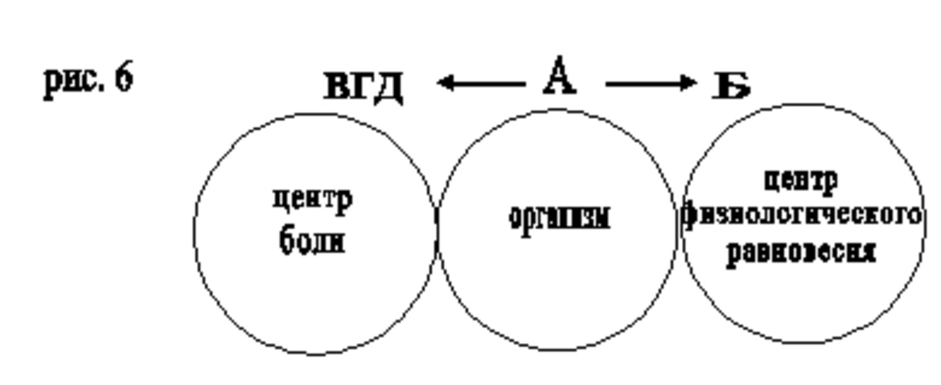 Всякий простой организм стремится достичь состояния равновесия через наслаждение и избежать боли, к которой ведет страх. Допустим, организм получил от окружающей среды информацию о ситуации «А» в виде определенной комбинации ощущений, направленной к центру боли и вызвавшей реакцию страха. Это значит, что для достижения в данной ситуации центра физиологического равновесия ему необходимо действовать в соответствии со схемой, скажем, «Б» (см. рис. 6). В противном же случае, оставаясь в ситуации «А» и далее, он рискует приблизиться через возрастающую реакцию страха к центру боли. Причем, сколько бы ни повторялась ситуация «А», он никогда не предпочтет другую схему поведения – «В», «Г» или «Д», а всегда будет поступать только в соответствии со схемой «Б». Только этот путь, как ему подсказывает рефлекс, приведет его через реакцию наслаждения к центру физиологического равновесия. Другой – уведет к боли и смерти.