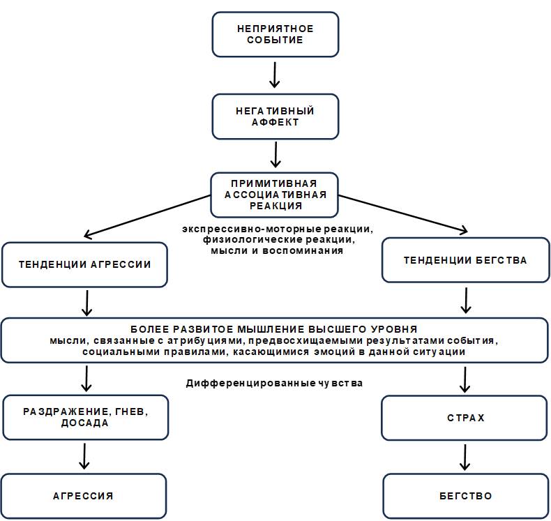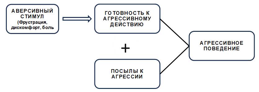 В новой концепции он фокусирует внимание на роли эмоциональных и когнитивных процессов и вводит понятие «негативный аффект». Негативный аффект – это медиатор между восприятием человеком аверсивных стимулов (фрустрация, боль, неприятные запахи, жара) и совершением человеком акта агрессии. Блокировка достижения цели не будет побуждать к агрессии, если она не переживается как неприятное событие и не формирует негативный аффект, выступающий необходимым условием совершения акта агрессии: то, как сам индивидуум интерпретирует воздействие, и определяет его реакцию на это воздействие. Получается, что объективно нейтральный стимул может субъективно восприниматься индивидом как аверсивный в силу активации через ассоциативное воспоминание негативного опыта и появление гнева. Верно и обратное утверждение: объективно негативный аверсивный стимул может не привести к агрессии, если не вызовет негативного аффекта, например в силу привычки. Кроме того, негативный аффект может привести не только к реакции агрессии, но и к бегству/ уклонению от ситуации.